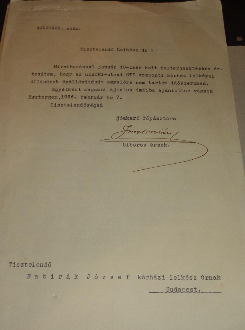 Serédy Justinián levele Babirák József plébánosnak.