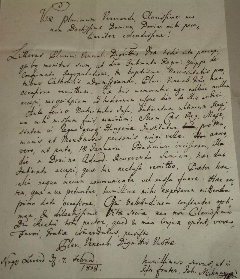 A mai napon illő módon megkaptam Főtisztelendő Méltóságod levelét, amelyben intett engem, hogy két királyi rendeletet (nevezetesen a megerősített újraházasodásról és a katolikus felek által kiszolgáltatott szükségkeresztségről szólót) küldjek vissza Főtisztelendő Uraságodnak ezen alkalommal. Az említettek közül eddig egyet sem kaptam meg, és a mai napig nem is hallottam róluk semmit. Karácsony ünnepe előtt az utolsó nekem megküldött királyi rendelet az volt, hogy tudniillik: Ő Császári és Királyi Felsége a Magyar Királyságban is intézetet kíván felállítani az elmebetegek és torzszülöttek számára. Ebben az évben azonban, úgy gondolom január 14-én Bazinba mentem, és azon a napon tisztelendő Semian úrtól kaptam meg ezt a két rendeletet, amelyeket ide mellékelve visszaküldök. Ezeken kívül mást velem nem közöltek és nem is küldtek. Amelyeket pedig tőlem kérnek, alázattal kérem, hogy az első adandó alkalommal küldjék meg nekem. Kívánok Önnek, kedves élettársának, valamint a Tekintetes ...... úrnak is tiszta szívből állandó jó egészséget, amit a feleségem is kíván. Maradok kegyes jóindulatába ajánlva: