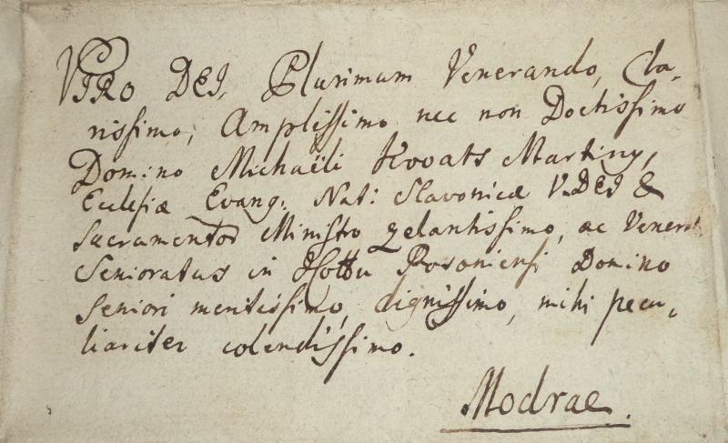 A címzett Kováts Martiny Mihály evangélikus lelkész és esperes, Modor.