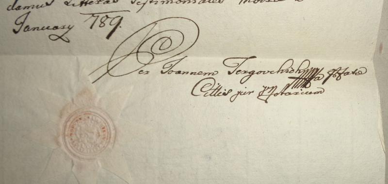 Nos N. N. Judex, Consul, et Senatores Liberae ad Regiae Civitatis Modrensis notum facimus Tenore praesentium, Quod deimo pro pertractandis publicis Negotiis in Curia praetoria Liberae ad Regiae Civitatis istius condedissemus, unaq[ue] fuissemus constituti, eotum Rosina, Samuelis condam Hajnóczy Filia 23 Annorum nos debite requisivit in eo: quatenus eidem cum Joanne Levius Matrimonium inire volenti facultatem nubendi daremus; Cujus Petitioni annuentes, eidem super concessa per nos nubendi facultate praesentes Sigillo munitas extradamus Litteras Testimoniales Modrae die 28va January 789.