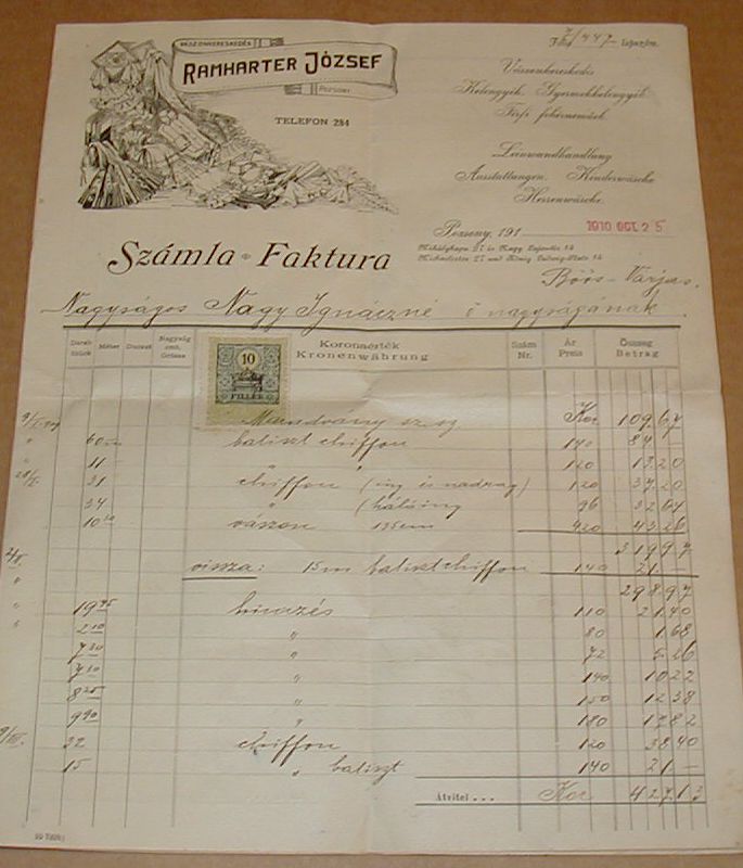 RAMHARTER JÓZSEF Vászonkereskedés. Pozsony.
